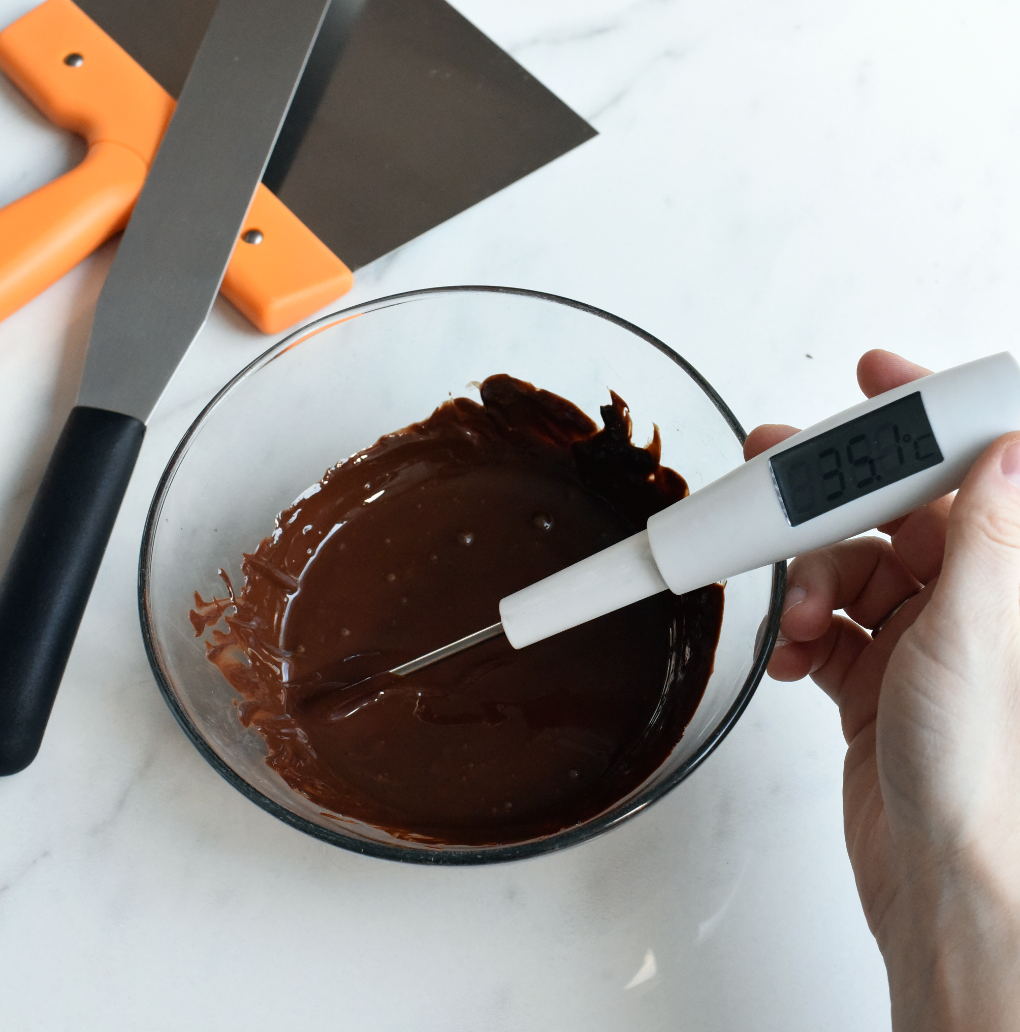 Vi varmer opp til de krystallene vi ikke ønsker har smelta helt, kjøler kontrollert ned (holder hele sjokolademassen på omtrentlig samme temperatur) til det punktet hvor krystallene vi ønsker dannes, for så å varme den litt opp igjen for å få en sjokolade som er lettere å jobbe med.