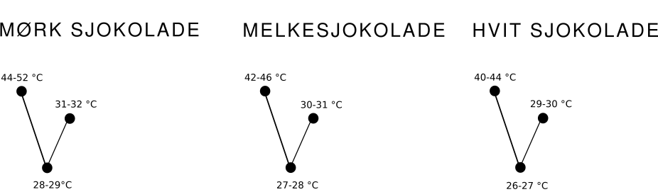 Sjokoladen varmes opp til et gitt punkt, kjøles ned til en temperatur og varmes så noe opp igjen. Disse temperaturene varierer etter innholdet i sjokoladen. Temperaturgrafene er derfor delt inn i mørk, lys og hvit sjokolade. Her er det viktig med et godt termometer, for to grader feil kan ødelegge hele prosessen din.